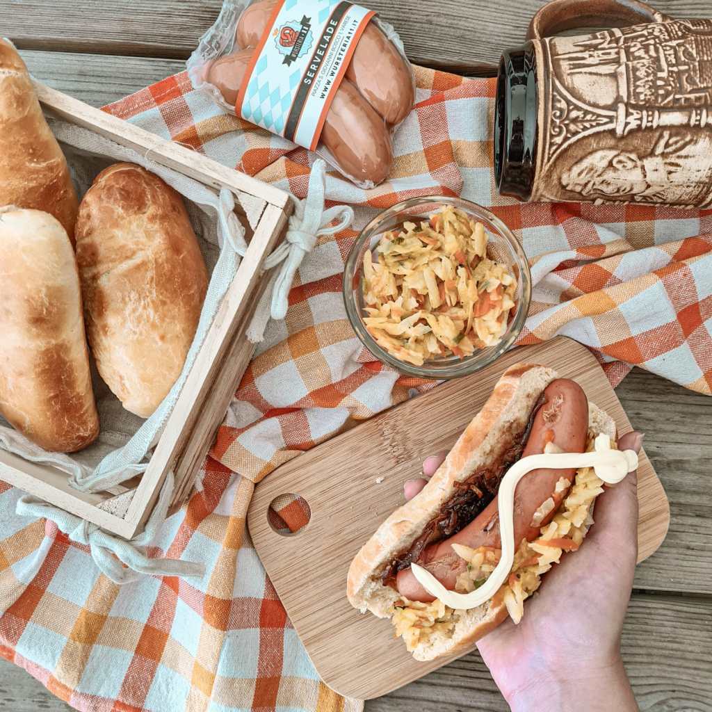 Perché allora non combinare l’influenza americana con quella tirolese? è proprio quello che abbiamo fatto oggi, proponendovi questa ricetta da acquolina in bocca contagiosa! Tutto ciò che vedete nello scatto lo abbiamo preparato noi, compreso il pane per gli hot dog (tranne i wurstel ovviamente, quelli sono della Wursteria11 di Varese). Noi abbiamo farcito i nostri Hot Dog con cipolle caramellate, verdure saltate e crema al parmigiano! Siete pronti per mettere le mani in pasta?! 🌭