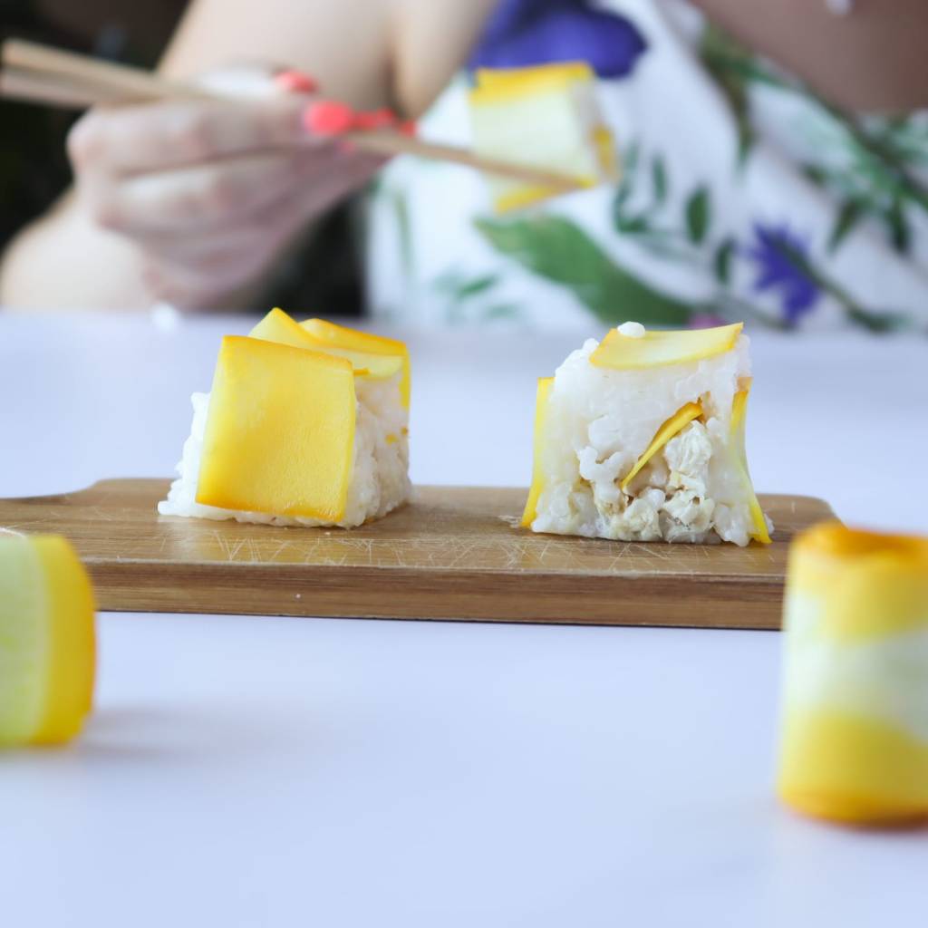 Sappiamo cosa state pensando: è ben diverso a livello estetico rispetto a quello che solitamente si mangia nei ristoranti giapponesi, ma vi assicuriamo che adoperare la zucchina al posto dell’alga ha le sue difficoltà… vi possiamo dire però che per quanto riguarda il gusto non ha quasi nulla da invidiarvi. Se non siete amanti del sushi con pesce crudo, la nostra versione con lo storione sott’olio fa proprio per voi!